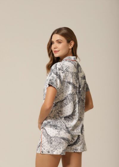 O diferencial está nos detalhes: o cetim laranja dá um toque vibrante e contemporâneo à peça, criando um contraste sofisticado e moderno com a paleta neutra da estampa. Esse pequeno detalhe eleva o look e transforma o pijama em uma escolha estilosa não só para dormir, mas também para curtir o homewear com muito mais originalidade. Um visual que se destaca pela ousadia sutil e bom gosto.