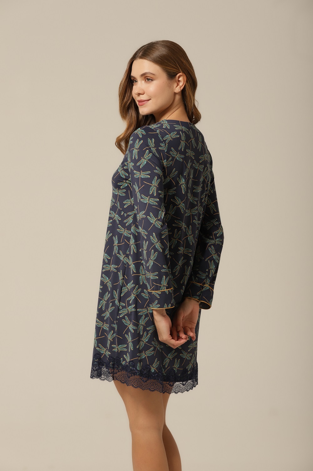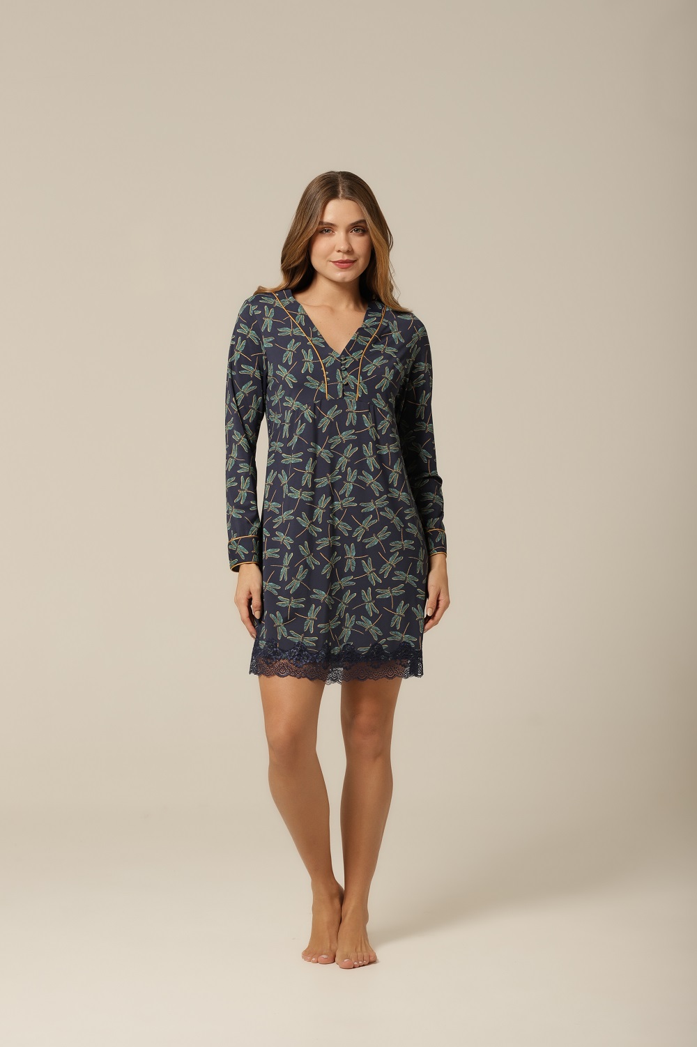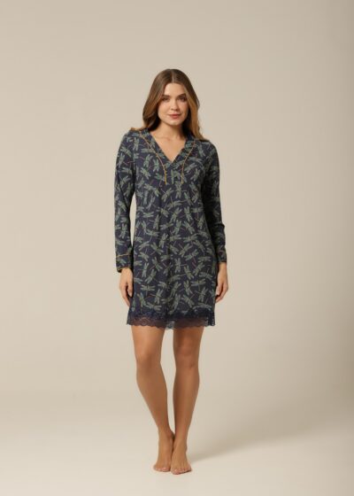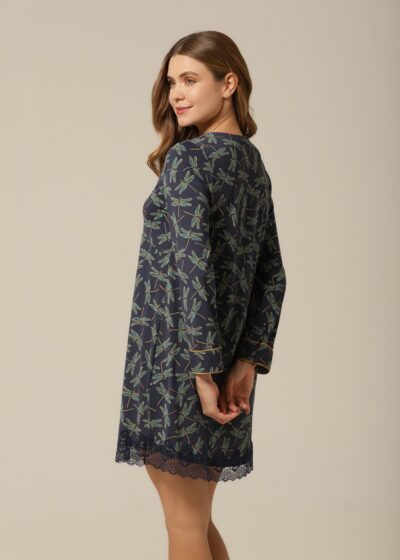 Apresentamos o pijama de fluity com estampa exclusiva de libélulas — um verdadeiro sucesso da nossa coleção! Com um visual encantador em tons de verde e dourado sobre fundo azul marinho, essa estampa conquistou corações por onde passou. As libélulas representam leveza, renovação e harmonia, tornando esse conjunto não apenas lindo, mas também simbólico.