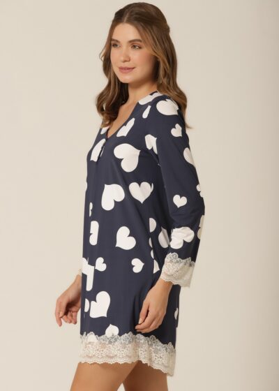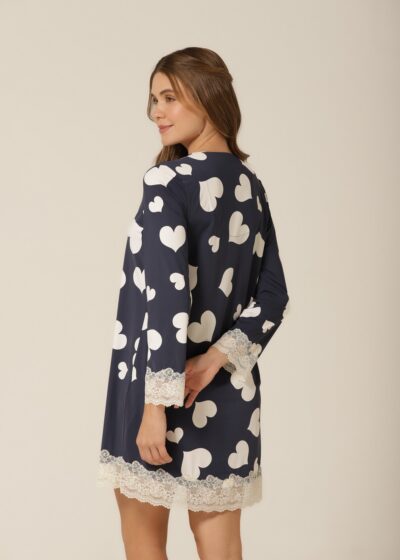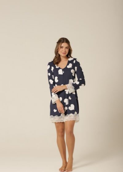 Este pijama com estampa delicada de corações em off-white sobre fundo azul marinho foi confeccionado em Fluity, um tecido nobre que proporciona um toque sedoso e caimento impecável. Sua textura suave se molda ao corpo, garantindo frescor durante as noites mais quentes e aconchego nas temperaturas amenas. Ideal para quem valoriza conforto sem abrir mão da elegância mesmo nos momentos de descanso. Sinta-se abraçada pela maciez e leveza de um material de alta qualidade que faz toda a diferença no seu bem-estar diário.