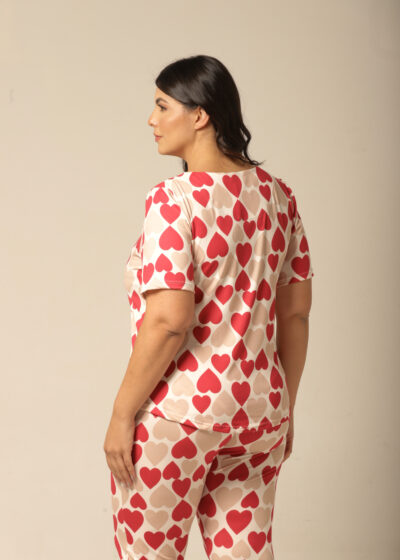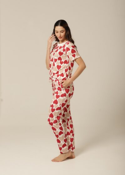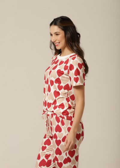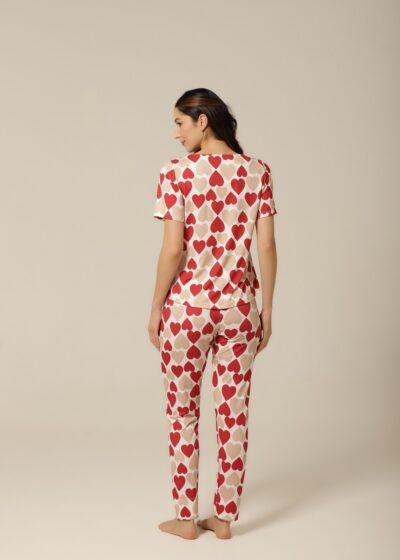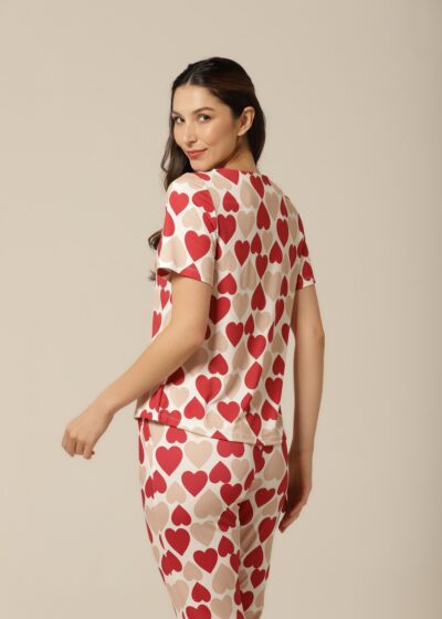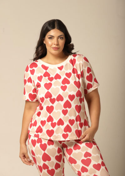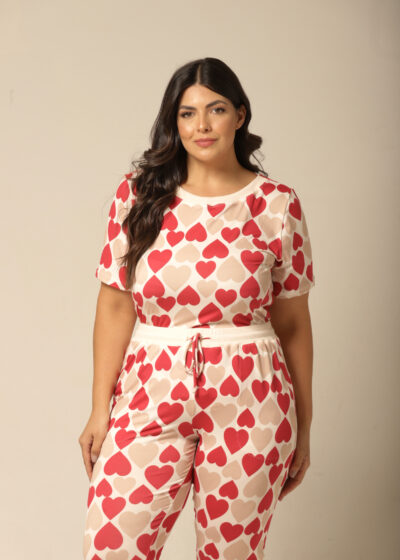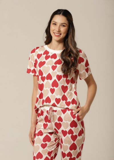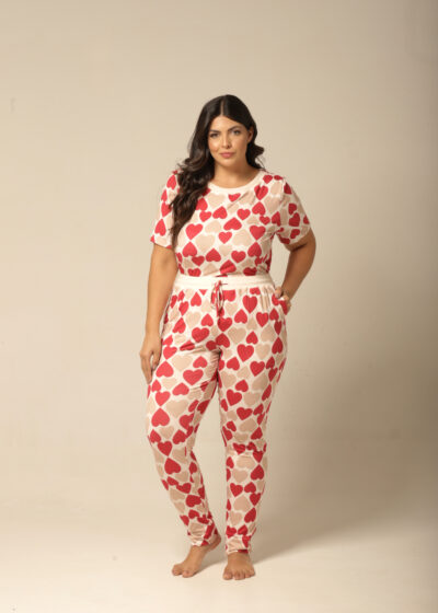 Nada como sentir-se aconchegada após um longo dia, e este conjunto pijama feminino com estampa de corações é o abraço que você merece! Com uma mistura romântica de vermelho e bege, este pijama de mangacurta com calça oferece um caimento perfeito e um toque macio que envolve o corpo com delicadeza. Ideal para as noites mais fresquinhas, ele proporciona conforto térmico e um visual apaixonante. Vista-se de amor e aconchego todas as noites com esse look irresistível!