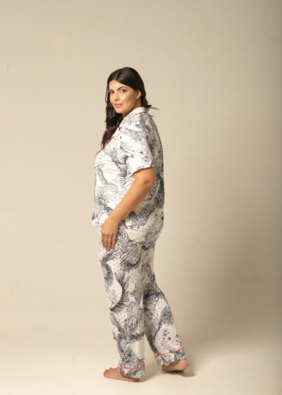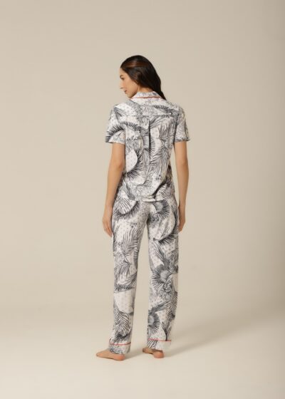 O diferencial está nos detalhes: o cetim laranja dá um toque vibrante e contemporâneo à peça, criando um contraste sofisticado e moderno com a paleta neutra da estampa. Esse pequeno detalhe eleva o look e transforma o pijama em uma escolha estilosa não só para dormir, mas também para curtir o homewear com muito mais originalidade. Um visual que se destaca pela ousadia sutil e bom gosto.