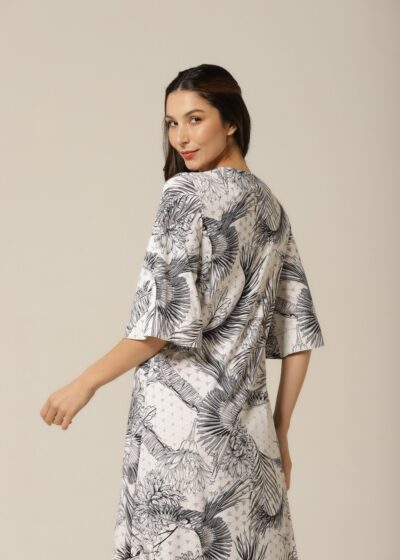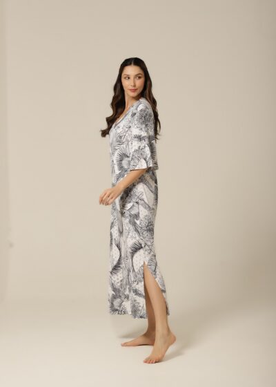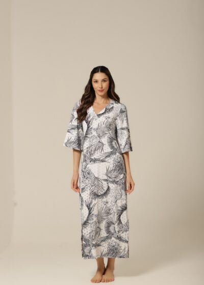 A kaftan longa em tecido fluity traz o equilíbrio perfeito entre sofisticação e conforto para os seus momentos de relaxamento. Com uma estampa moderna de araras em preto sobre fundo off-white, a peça traduz o espírito leve do homewear com um toque artístico e contemporâneo. Seu caimento solto e o toque geladinho do fluity tornam essa kaftan uma escolha ideal para os dias mais quentes — seja para um dia em casa ou para uma saída descomplicada com estilo.