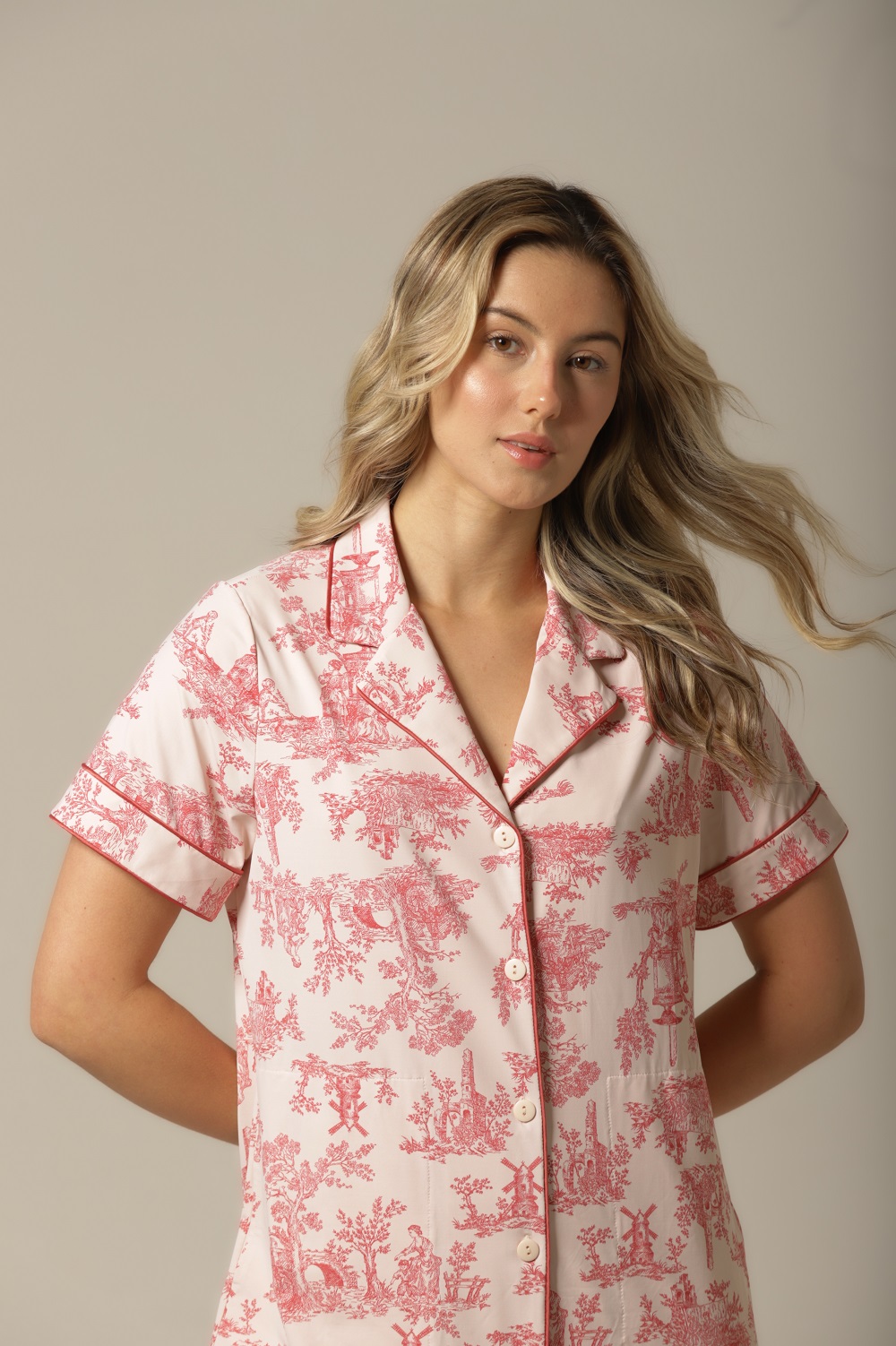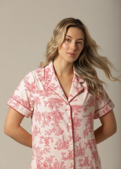 Encante-se com a estampa queridinha da coleção: a clássica toile de jouy em tons de rosa, que traduz sofisticação e romantismo em cada detalhe. O fundo rosa baby delicado combinado com o desenho em rosê elegante cria um visual harmonioso e refinado, perfeito para quem valoriza estilo e personalidade nas peças do dia a dia.