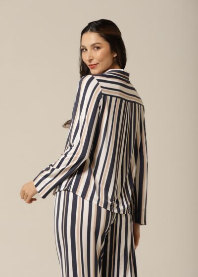 O diferencial está nos detalhes:a combinação de cores usado nas listras, criando um contraste sofisticado e moderno com a paleta neutra da estampa. Esse pequeno detalhe eleva o look e transforma o pijama em uma escolha estilosa não só para dormir, mas também para curtir o homewear com muito mais originalidade. Um visual que se destaca pela ousadia sutil e bom gosto.