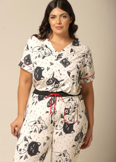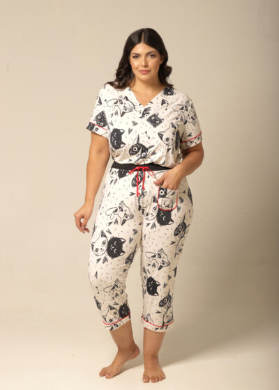 Este pijama capri apresenta um acabamento encantador com um viés de cetim vermelho, que adiciona um toque delicado e feminino ao modelo. A estampa de gatos fofos em cores suaves proporciona um estilo único e alegre, tornando-o uma escolha ideal para quem adora um toque de personalidade até na hora de dormir. Cada detalhe foi pensado para que você e sua família se sintam especiais e convenientes, seja na hora de relaxar em casa ou durante momentos em família.