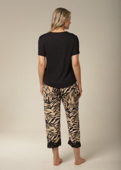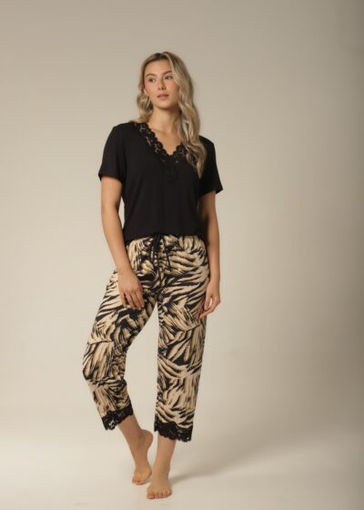A calça capri é o grande destaque deste conjunto: confeccionada em tecido fluity com estampa exclusiva de animal print, ela entrega um visual moderno e cheio de personalidade. Os tons sofisticados da estampa combinam perfeitamente com a blusa preta, criando um contraste elegante e atemporal. A renda aplicada na barra da calça eleva o design da peça, dando um toque refinado até aos detalhes mais sutis. Um look completo que vai te fazer sentir bem vestida mesmo nos momentos de descanso.