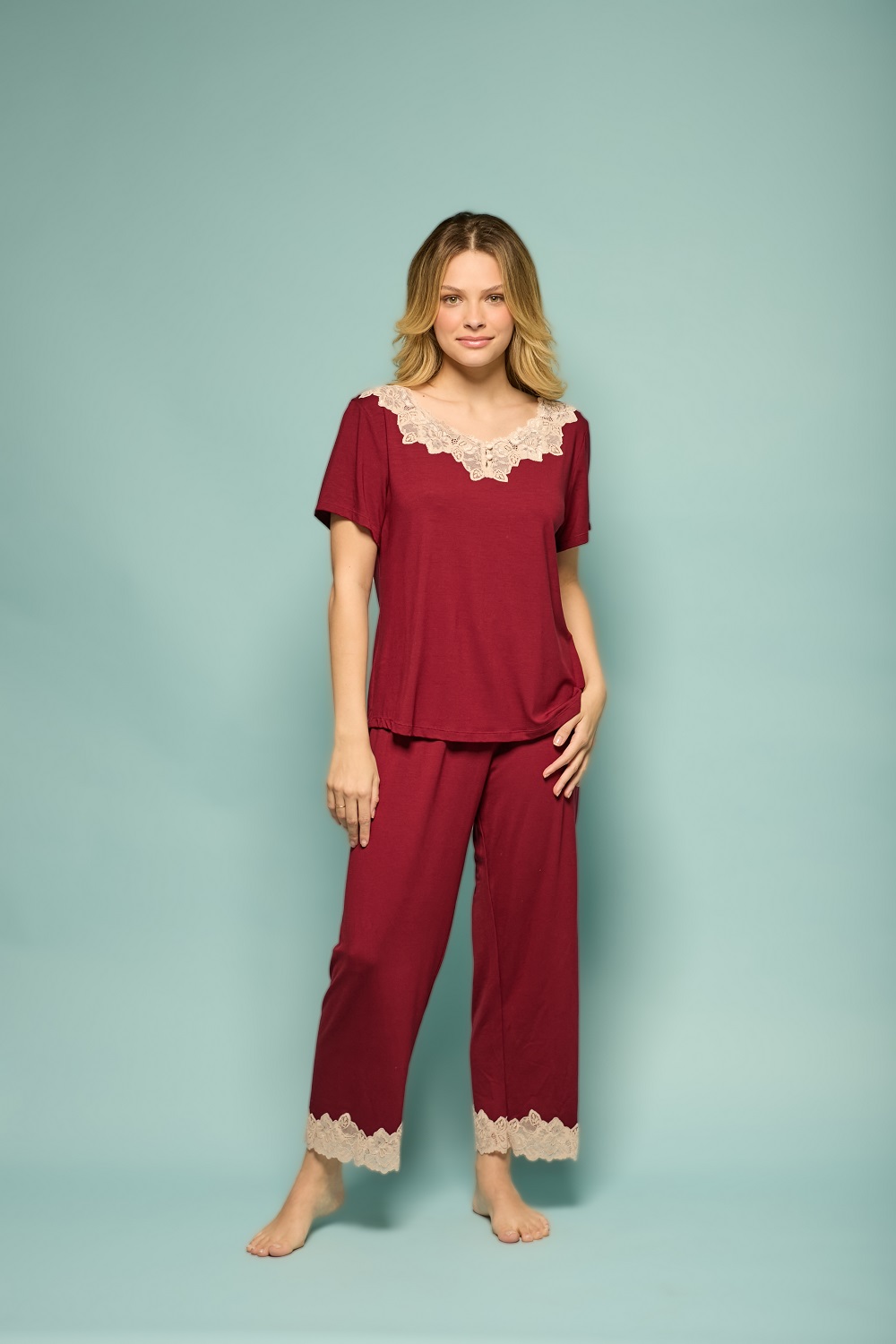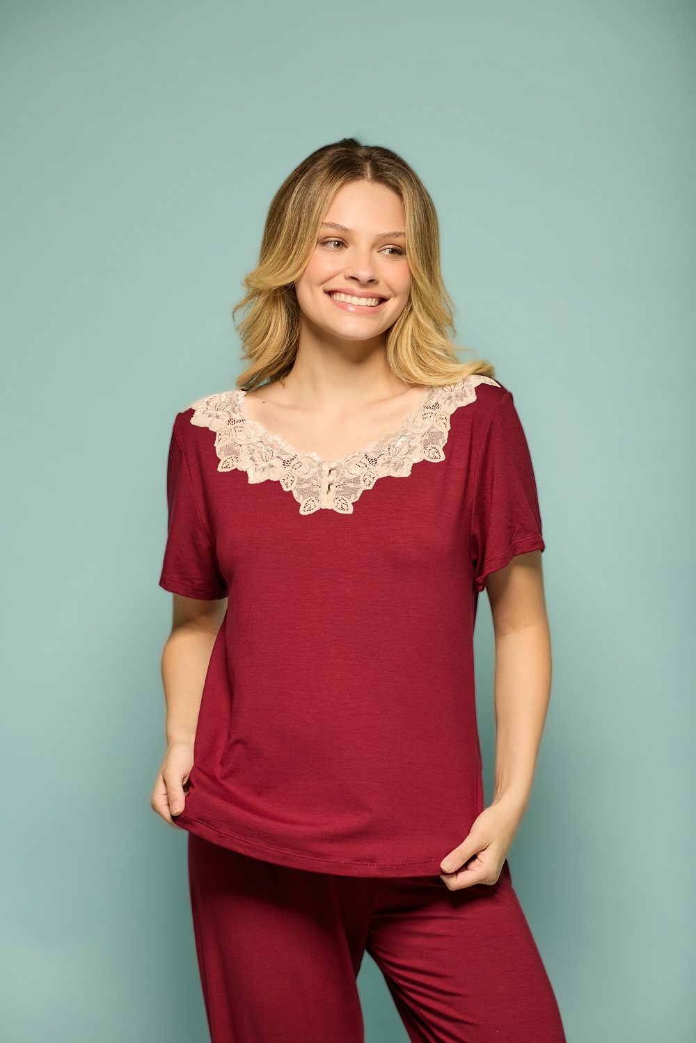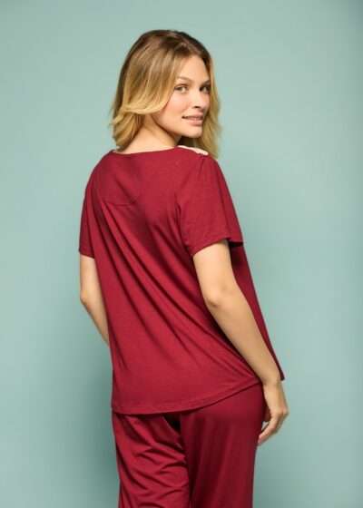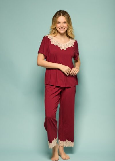 É o tipo de pijama capri feminino que funciona nas noites mais quentes, nos domingos preguiçosos e nos momentos de autocuidado pós-banho. Se quiser compor, um robe leve ou um cardigan fininho por cima e pantufas neutras fecham a cena. No corpo, a sensação é de frescor e caimento bonito; no olhar, o encontro do bordô com o dourado cria um clima acolhedor que transforma o seu ritual de descanso sem precisar de esforço.
