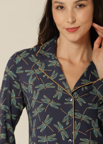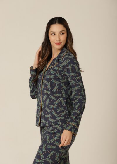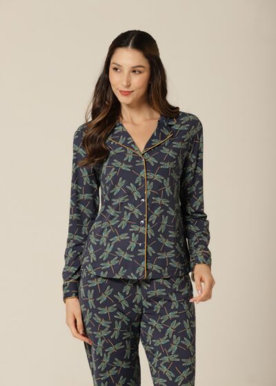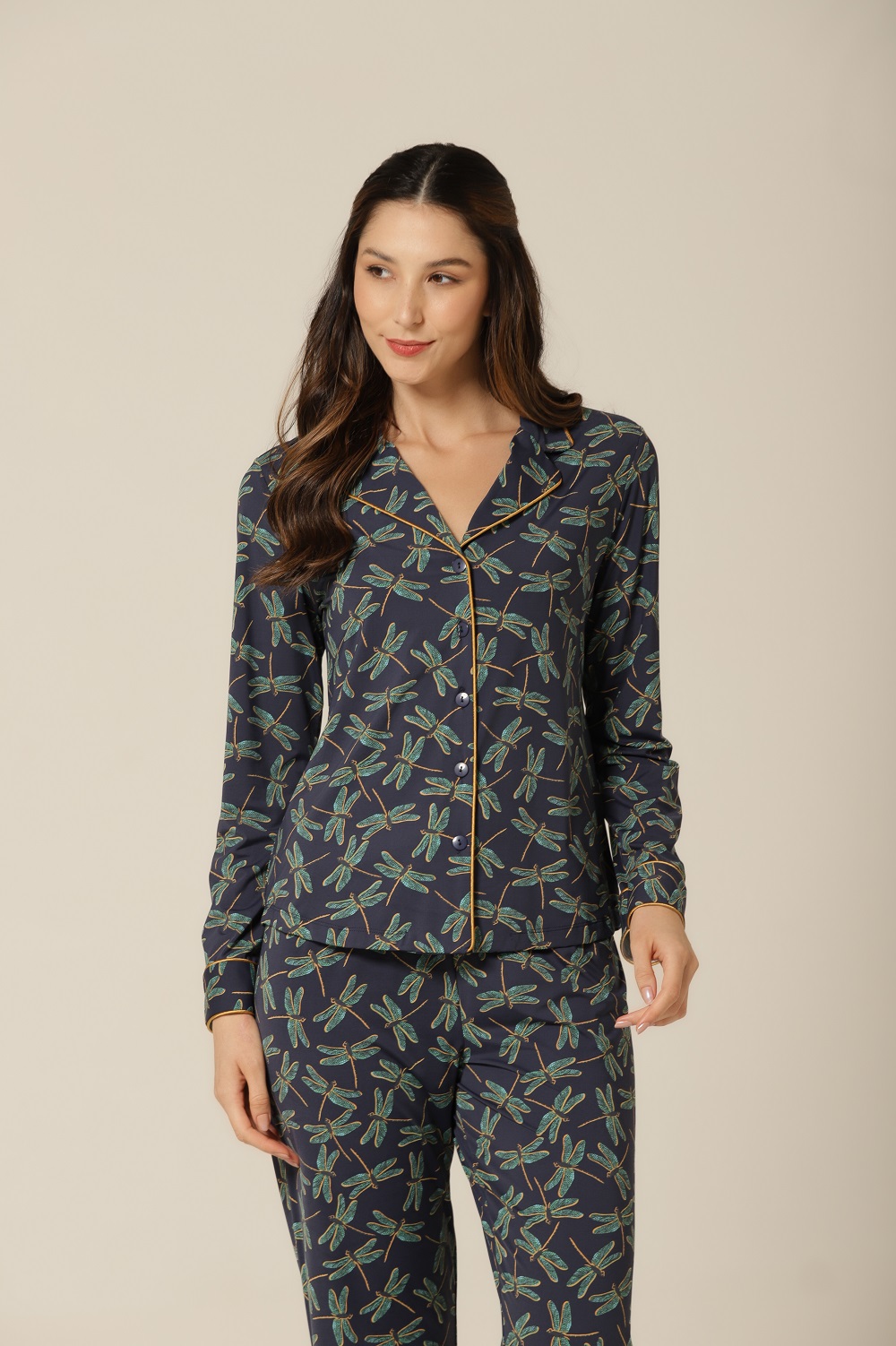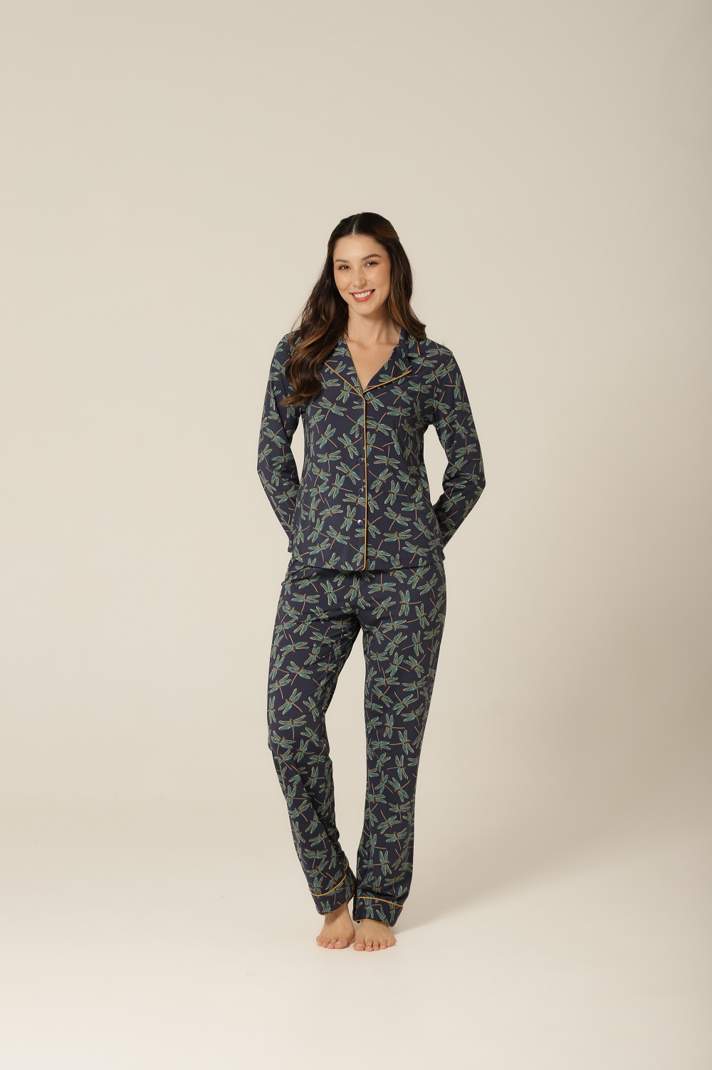 Apresentamos o pijama de fluity com estampa exclusiva de libélulas — um verdadeiro sucesso da nossa coleção! Com um visual encantador em tons de verde e dourado sobre fundo azul marinho, essa estampa conquistou corações por onde passou. As libélulas representam leveza, renovação e harmonia, tornando esse conjunto não apenas lindo, mas também simbólico.