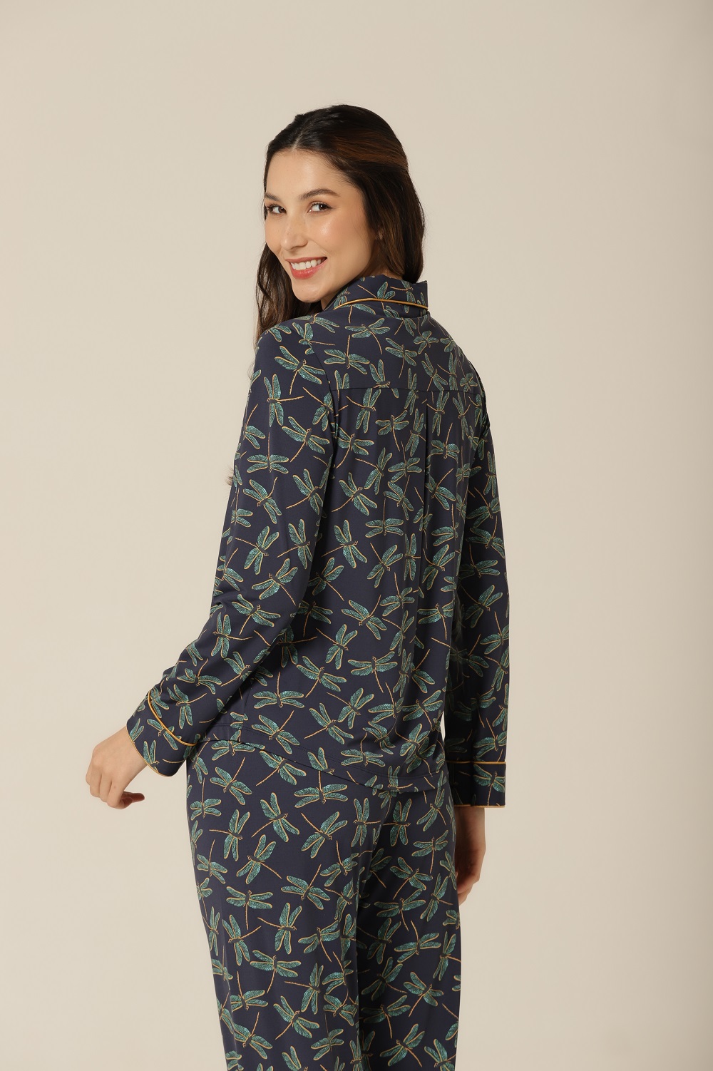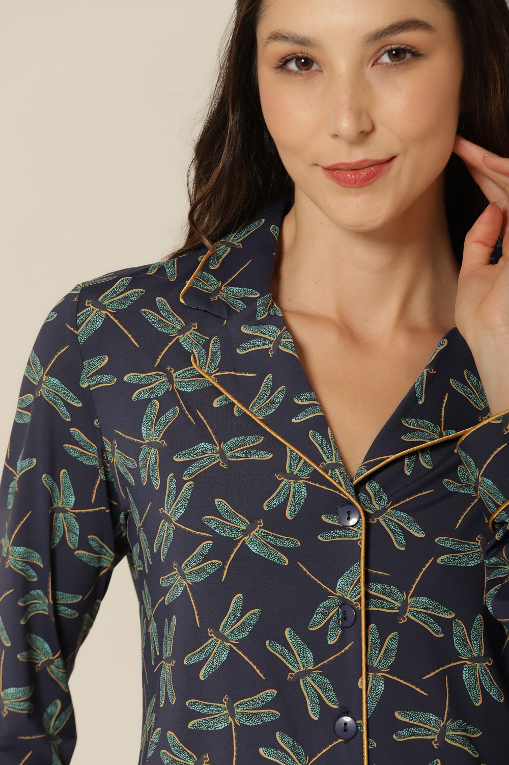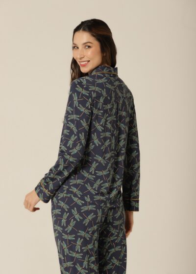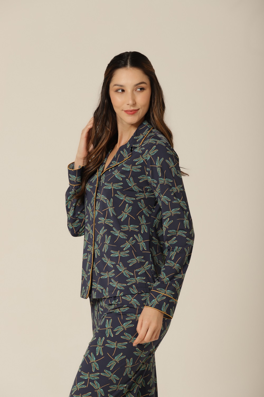 Apresentamos o pijama de fluity com estampa exclusiva de libélulas — um verdadeiro sucesso da nossa coleção! Com um visual encantador em tons de verde e dourado sobre fundo azul marinho, essa estampa conquistou corações por onde passou. As libélulas representam leveza, renovação e harmonia, tornando esse conjunto não apenas lindo, mas também simbólico.
