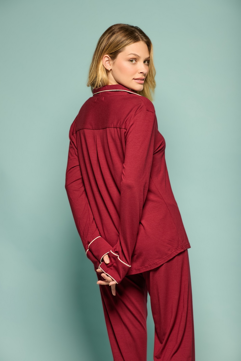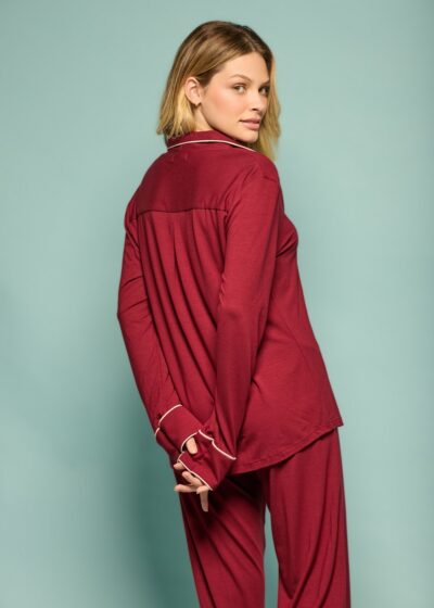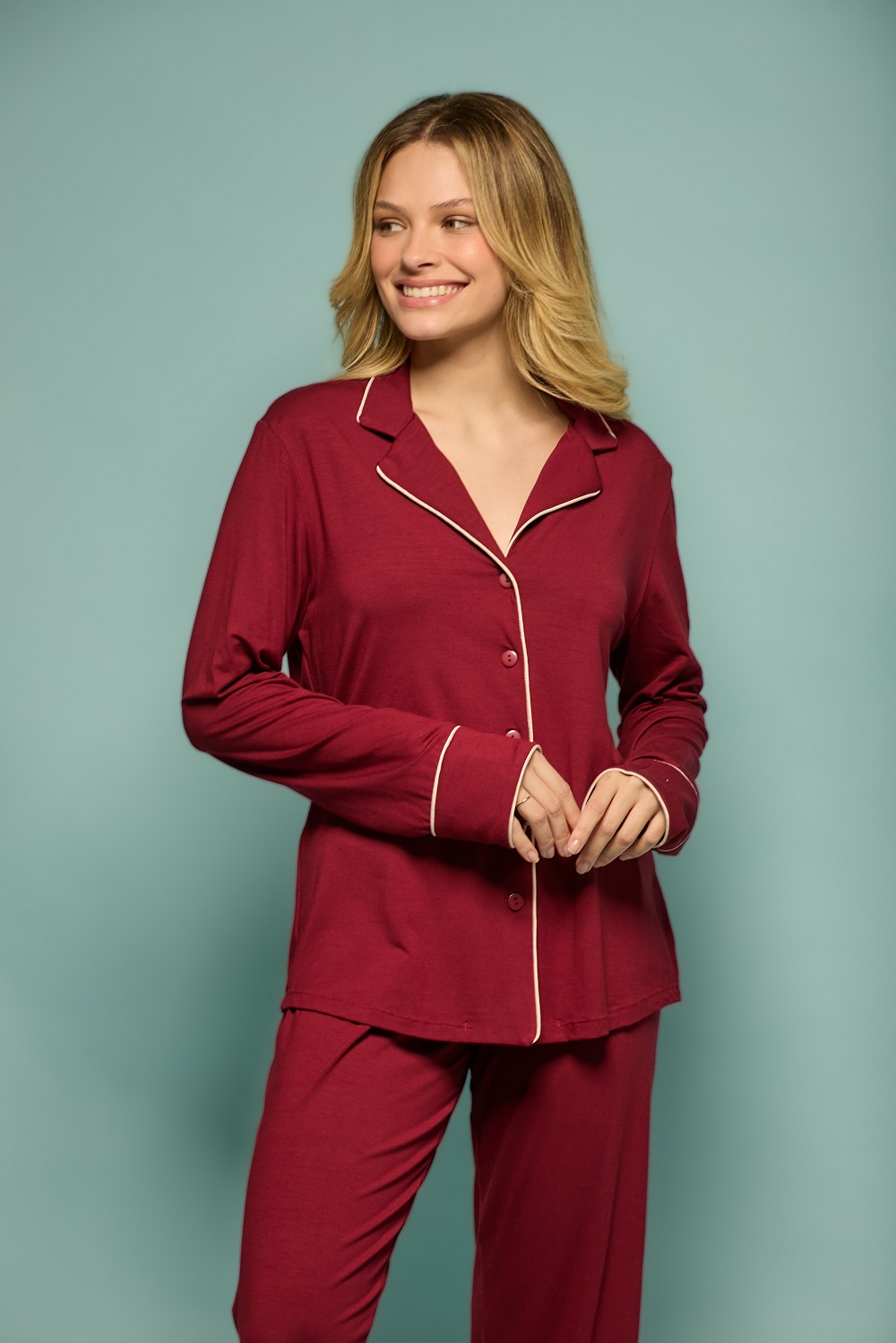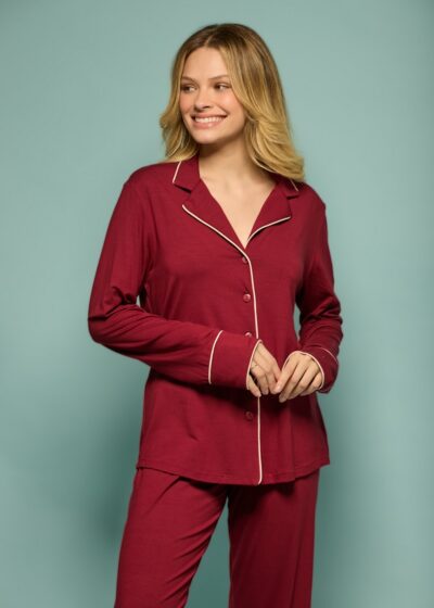 Quando a casa desacelera e você busca aquele respiro só seu, o bordô entra em cena como um abraço discreto. O toque é macio já no primeiro contato, daqueles que convidam a esquecer do relógio. A camisa abre por botões do início ao fim, prática para vestir sem pressa, e o viés de cetim desenha o contorno com um brilho sutil que chama o olhar sem roubar a calma do momento.