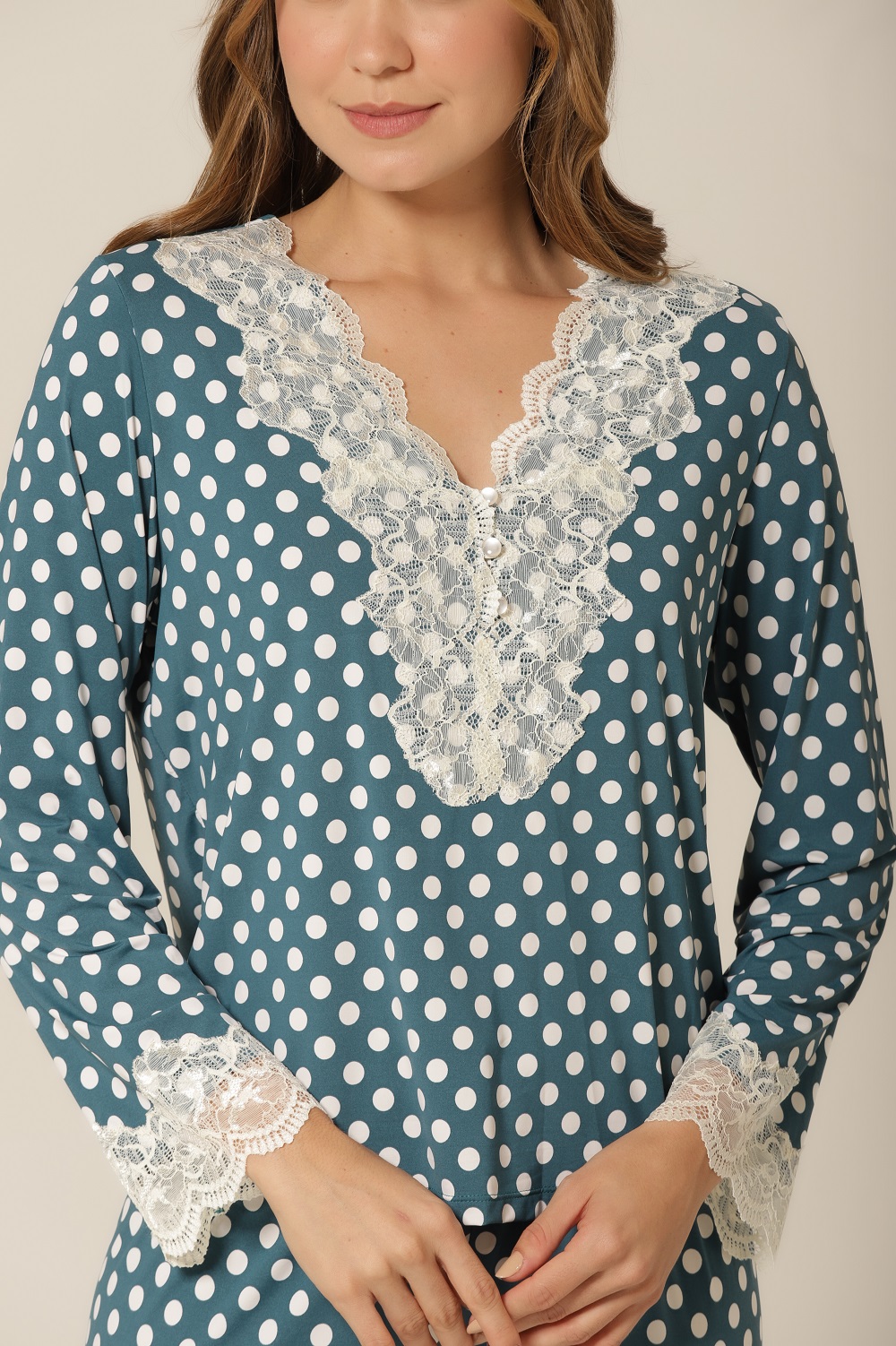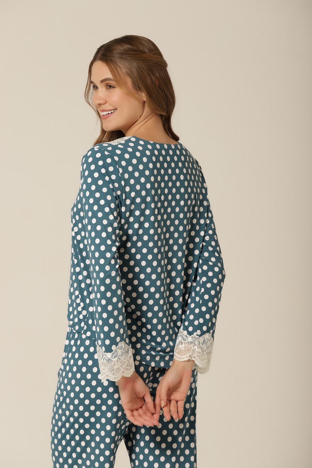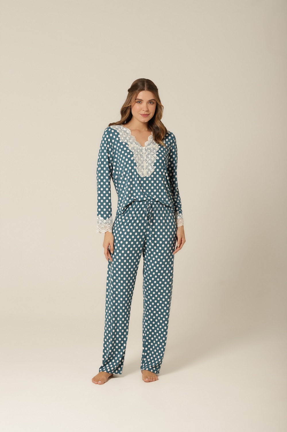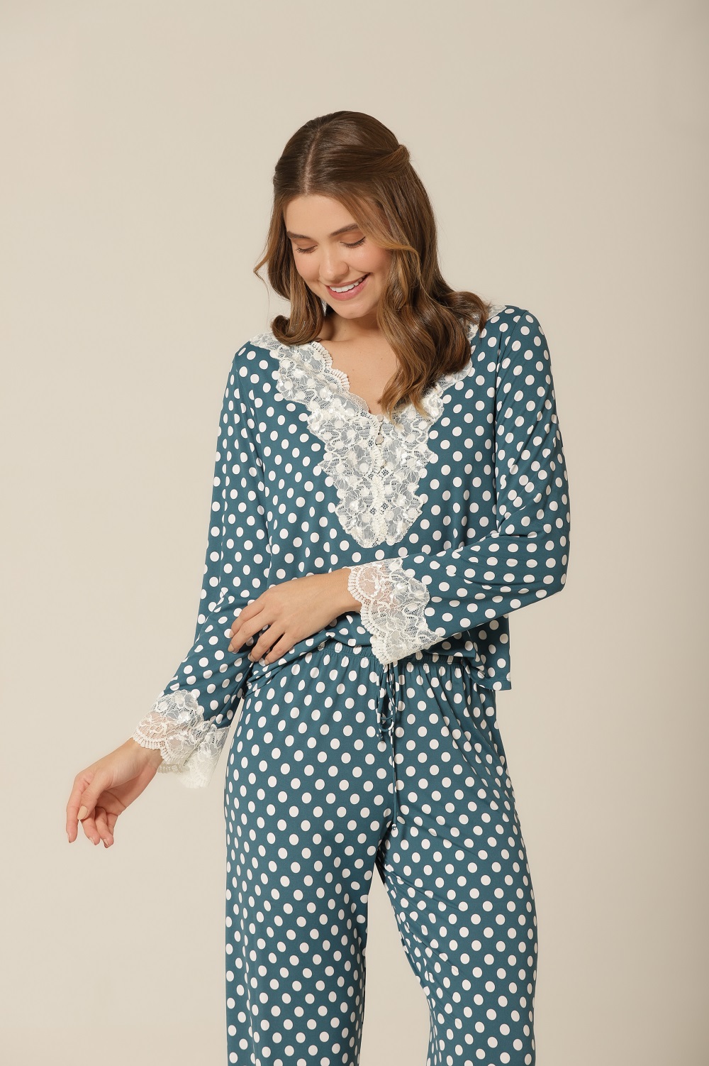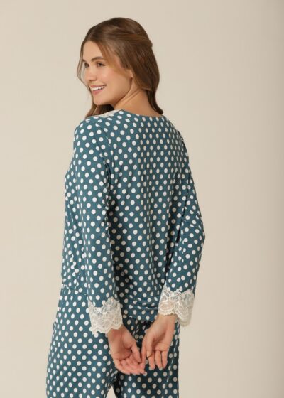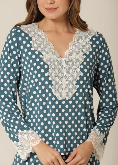 A estampa de poá é um clássico que atravessa gerações e tendências — e esse pijama de manga longa prova o porquê. Com um fundo verde suave contrastando com poás off-white, essa peça transmite charme retrô e feminilidade, ideal para quem busca uma moda confortável e cheia de personalidade. A aplicação de renda delicada no decote e nas mangas eleva o look com sofisticação, tornando-a perfeita tanto para relaxar em casa quanto para um dia casual cheio de estilo.