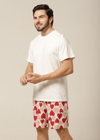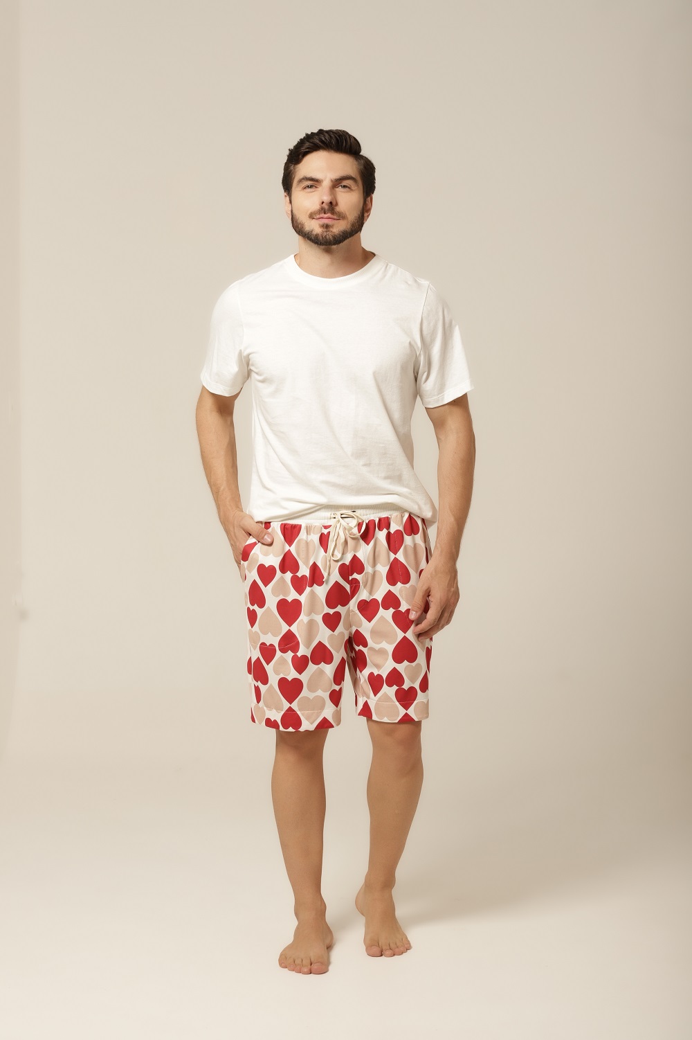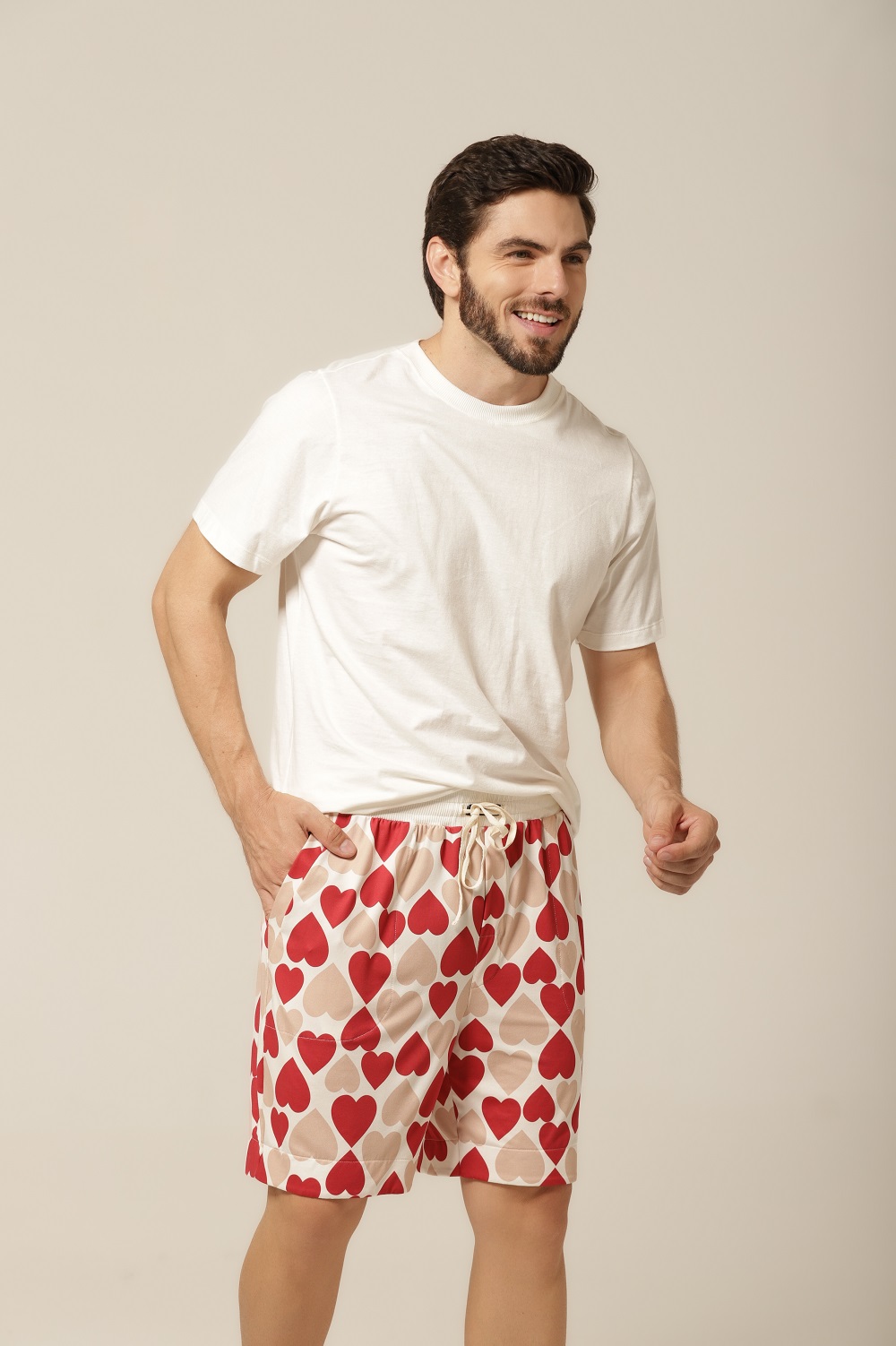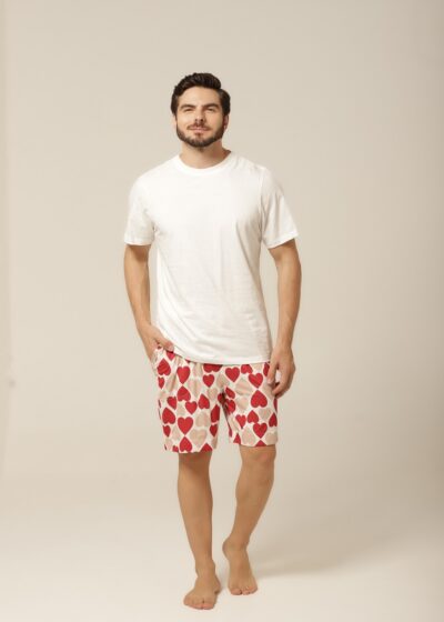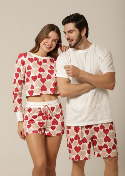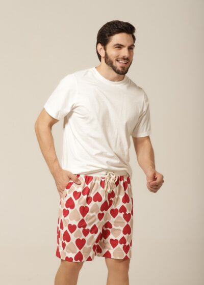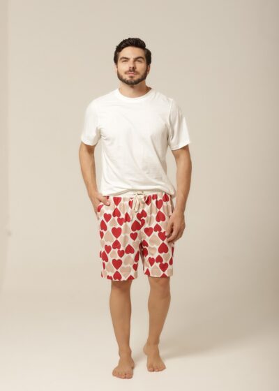 Quem disse que pijama precisa ser básico? Com uma estampa divertida de corações em tons de bege e vermelho, esse conjunto traz personalidade ao seu look de dormir. É o equilíbrio ideal entre o charme descontraído e o romantismo sutil. Perfeito para quem gosta de manter o bom gosto até na hora de relaxar. Além disso, o modelo combina com o pijama feminino da mesma linha, criando uma opção linda e divertida de pijama casal. Vista-se com carinho — sozinho ou a dois.