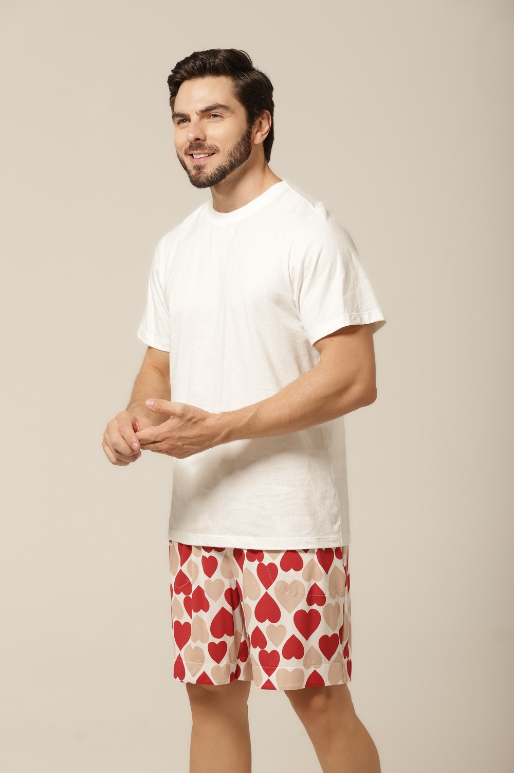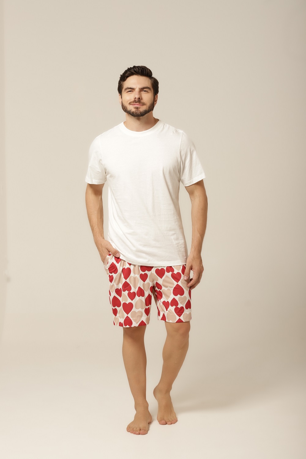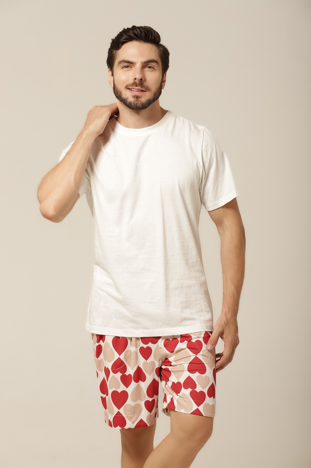 Quem disse que pijama precisa ser básico? Com uma estampa divertida de corações em tons de bege e vermelho, esse conjunto traz personalidade ao seu look de dormir. É o equilíbrio ideal entre o charme descontraído e o romantismo sutil. Perfeito para quem gosta de manter o bom gosto até na hora de relaxar. Além disso, o modelo combina com o pijama feminino da mesma linha, criando uma opção linda e divertida de pijama casal. Vista-se com carinho — sozinho ou a dois.
