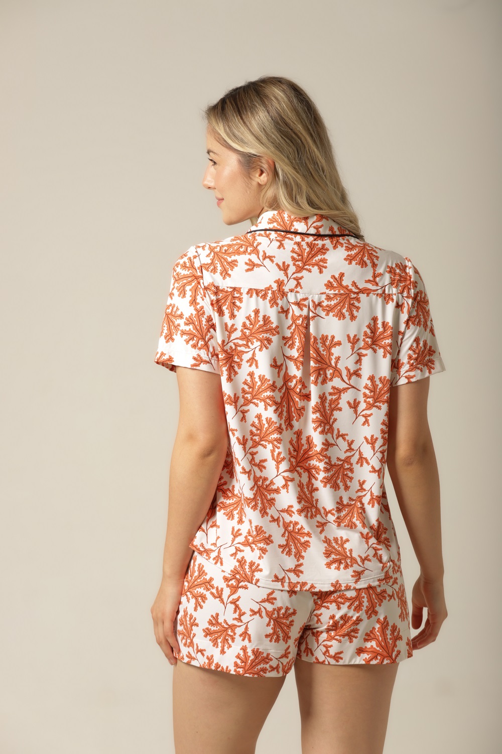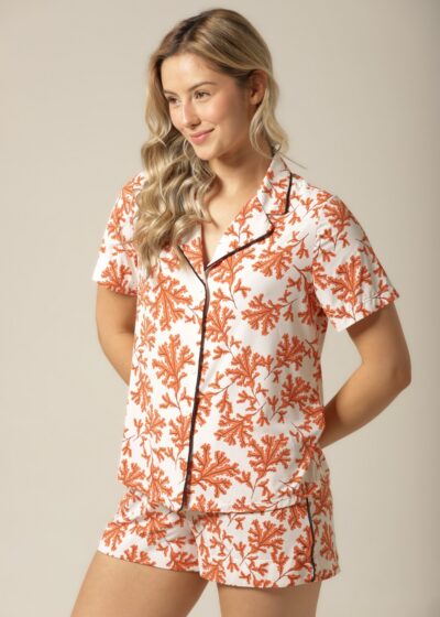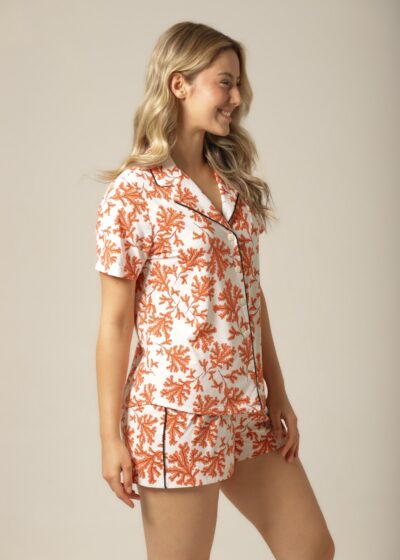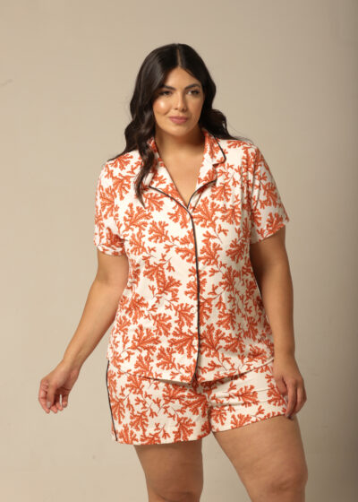 A estampa floral exclusiva em tons de laranja, combinada com o fundo off-white, cria uma harmonia visual sofisticada e acolhedora. O design foi pensado para transmitir feminilidade, leveza e modernidade, tornando o pijama uma escolha perfeita tanto para relaxar em casa quanto para se sentir confiante e elegante em momentos de autocuidado. É a prova de que conforto e elegância podem — e devem — caminhar juntos.