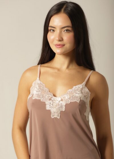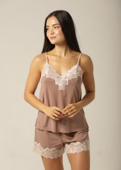 A cor avelã, tendência sofisticada da estação, traz calor, modernidade e versatilidade ao visual. Esse tom neutro e elegante valoriza todos os tons de pele e transmite aconchego e requinte. Perfeito para quem busca um pijama moderno, feminino e alinhado às tendências da moda sleepwear, ele eleva o conceito de roupa de dormir a um novo patamar de estilo.