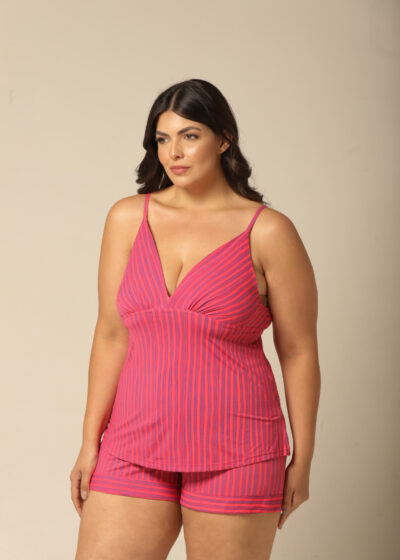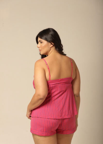 Conjunto short doll, com alças reguláveis em estampa exclusiva e moderna de listras, decote V. Confeccionado em estampa exclusiva de fluity.