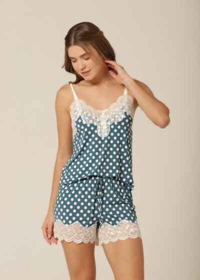 A estampa de poá é um clássico que atravessa gerações e tendências — e esse short doll prova o porquê. Com um fundo verde suave contrastando com poás off-white, essa peça transmite charme retrô e feminilidade, ideal para quem busca uma moda confortável e cheia de personalidade. A aplicação de renda delicada no decote e no shorts eleva o look com sofisticação, tornando-a perfeita tanto para relaxar em casa quanto para um dia casual cheio de estilo.