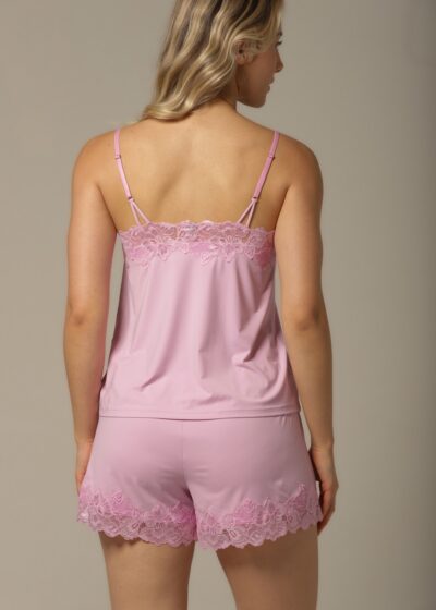 Conjunto short doll, com alças reguláveis em fluity lilás, com renda no mesmo tom aplicada no decote e na barra do shorts trazendo leveza e feminilidade a peça.