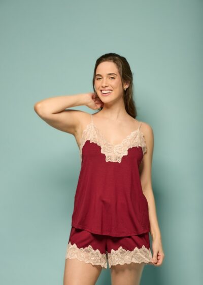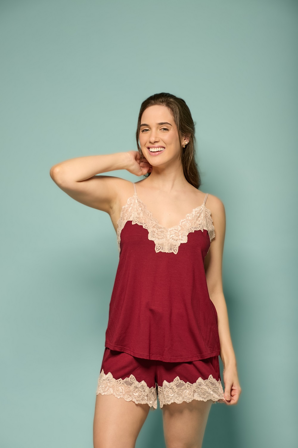 A cor bordô dá profundidade ao visual, enquanto a renda bege contorna o decote da regata e a barra do shorts com delicadeza. As alças finas mantêm o desenho minimalista e feminino, e a modelagem soltinha equilibra charme e conforto com naturalidade. Vai bem nas noites mais quentes, nas manhãs preguiçosas de café e nos momentos de autocuidado em casa — combine com um robe leve ou um cardigan macio e deixe o tecido trabalhar a favor do seu tempo.