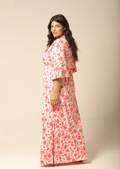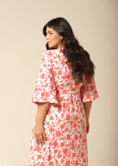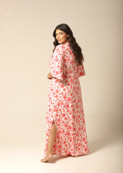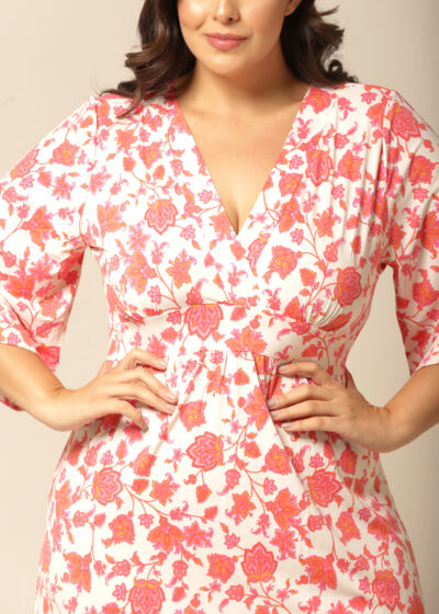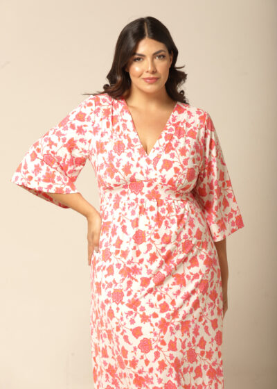O vestido conta com um decote em V adornado por um viés pink, que valoriza o colo de forma elegante. As mangas curtas proporcionam um toque de frescor, enquanto as fendas laterais adicionam um elemento de movimento e dinamismo à peça. Cada detalhe foi cuidadosamente pensado para garantir que você se sinta confortável e linda, não importa a ocasião. Este vestido é a escolha ideal para quem valoriza a beleza e a funcionalidade em suas roupas.