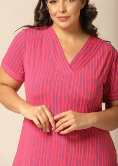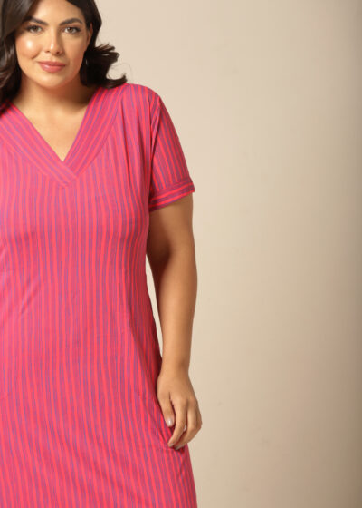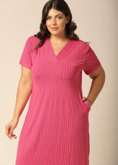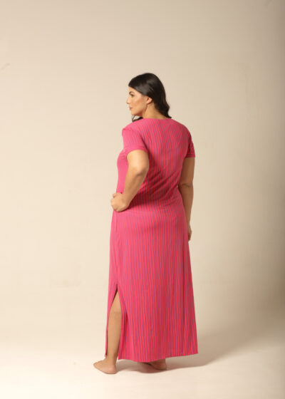 Vestido longo, amplo em estampa exclusiva e moderna de listras em tons de rosa e lilás. Com fendas nas laterias, bolsos, e mangas curtas.