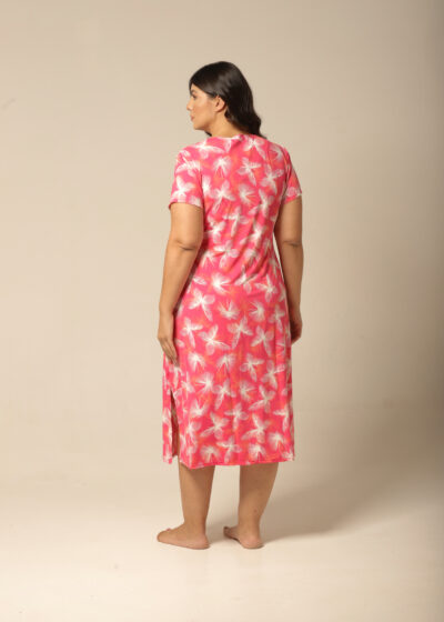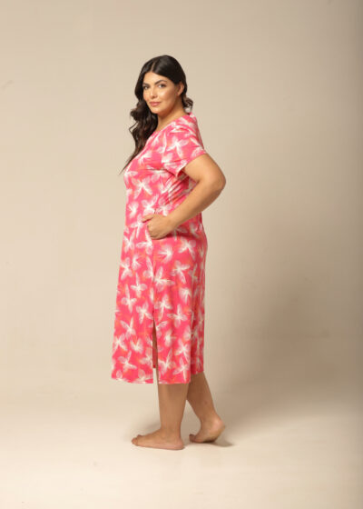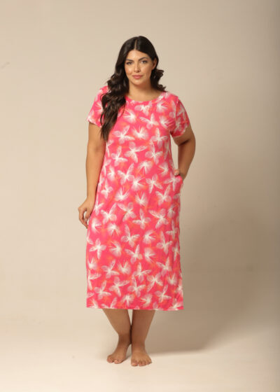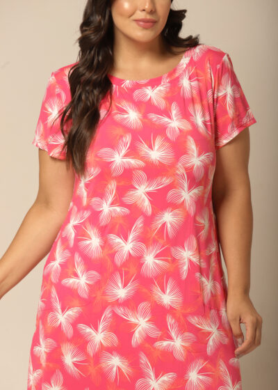 Vestido Midi, amplo em estampa exclusiva e moderna de borboletas em tons de off-white e laranja, em fundo pink. Com fendas nas laterias, bolsos, e mangas curtas.