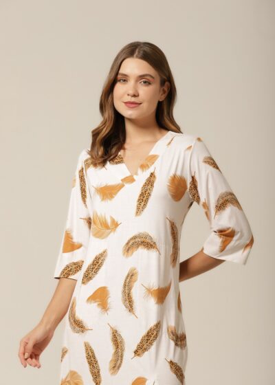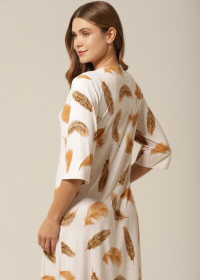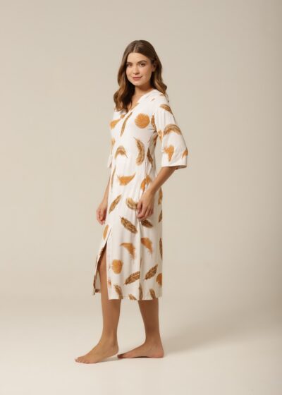 O Kaftan Midi em tecido fluity com estampa de penas e animal print é a escolha perfeita para quem valoriza elegância com praticidade. Com decote V, comprimento midi, fenda frontal e bolsos laterais, essa peça une o charme da modelagem fluida ao conforto do dia a dia. A combinação dos tons dourado, preto e marrom imprime sofisticação e modernidade ao visual.