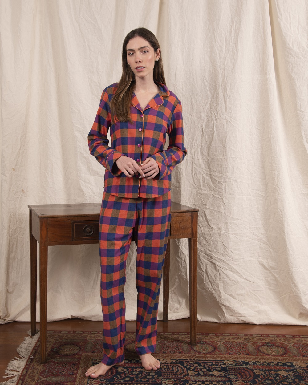 Descubra o equilíbrio perfeito entre conforto e elegância com o nosso pijama de botões no clássico estilo americano. Produzido em flanela xadrez, este pijama é a escolha ideal para quem valoriza um design tradicional com um toque moderno. O modelo de botões proporciona um ajuste impecável e um visual sofisticado, enquanto o estilo americano garante liberdade de movimento e um toque de classe. Perfeito para relaxar em casa ou para noites de descanso com muito estilo e aconchego.