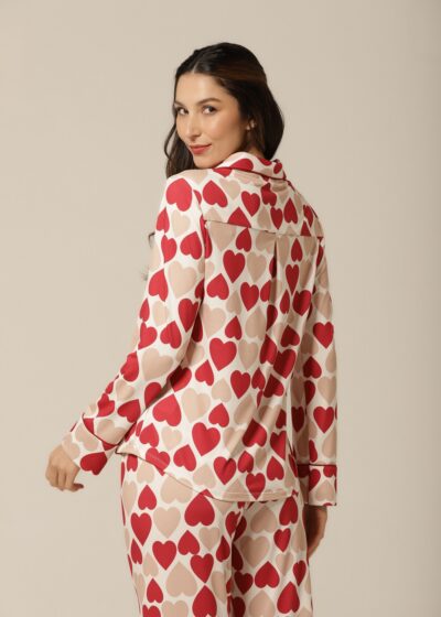 O charme da peça está na estampa divertida de corações em tons de bege e vermelho — perfeita para mulheres que gostam de unir conforto e estilo mesmo nas horas de descanso. Uma proposta moderna com um toque romântico, que traduz carinho e leveza. Para tornar tudo ainda mais especial, existe o pijama masculino combinando, criando uma opção linda de pijama casal para momentos a dois cheios de conforto e sintonia.
