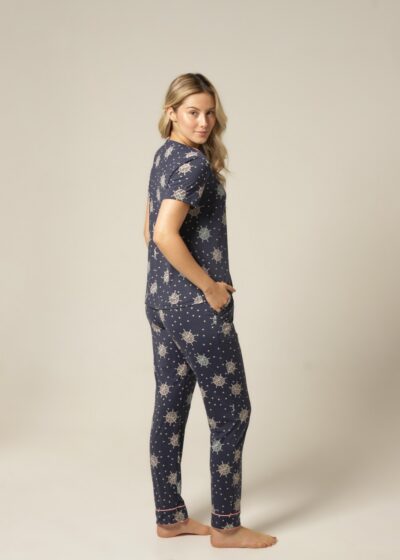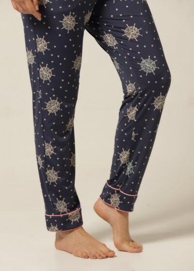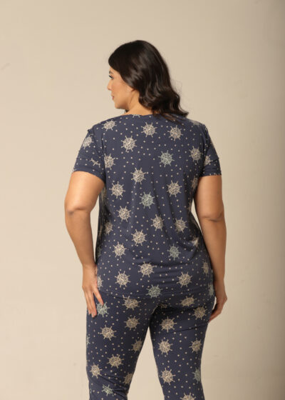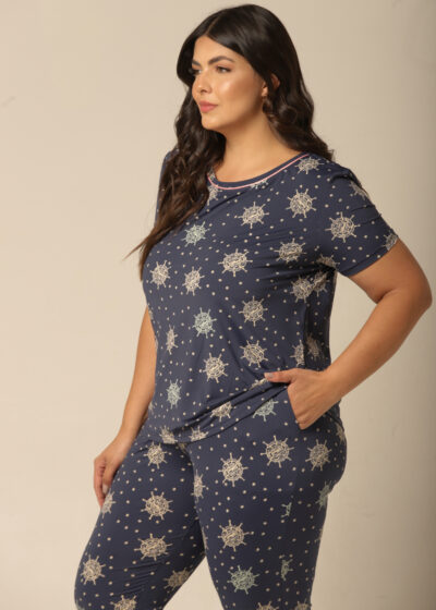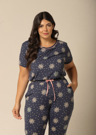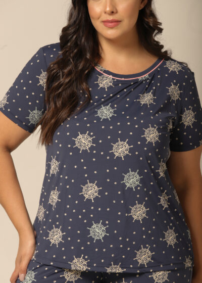 Transforme as noites em alto-mar de conforto com o pijama com estampa de timão de navio, feito em Fluity de toque gelado e ultra macio. Com um fundo azul-marinho elegante e uma estampa exclusiva, divertida e jovial, este pijama é a escolha ideal para quem ama unir estilo com bem-estar.