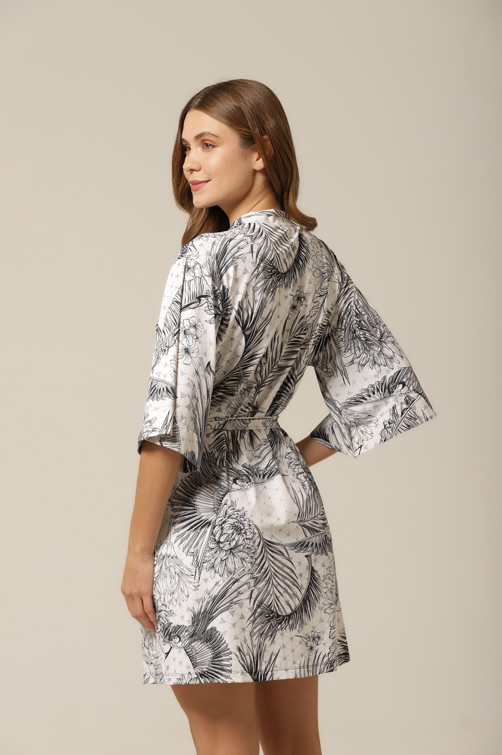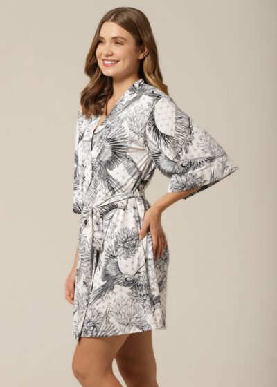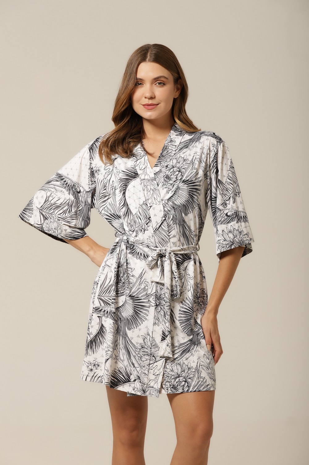 Robe curto, estilo kimono, em fluity com estampa exclusiva. Ideal para compor junto com a camisola, ou o pijama de short com alça.